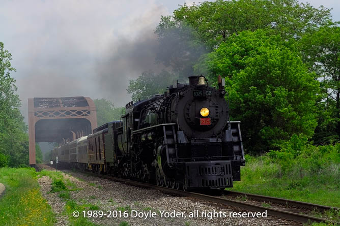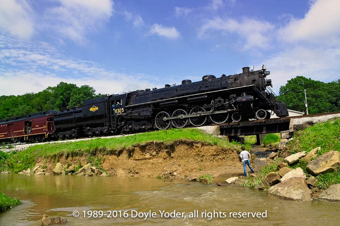 RAILROADS, OH - Ohio Central Steam Engine 6325 southbound with passenger train crossing bridge near West Lafayette 6-12-04